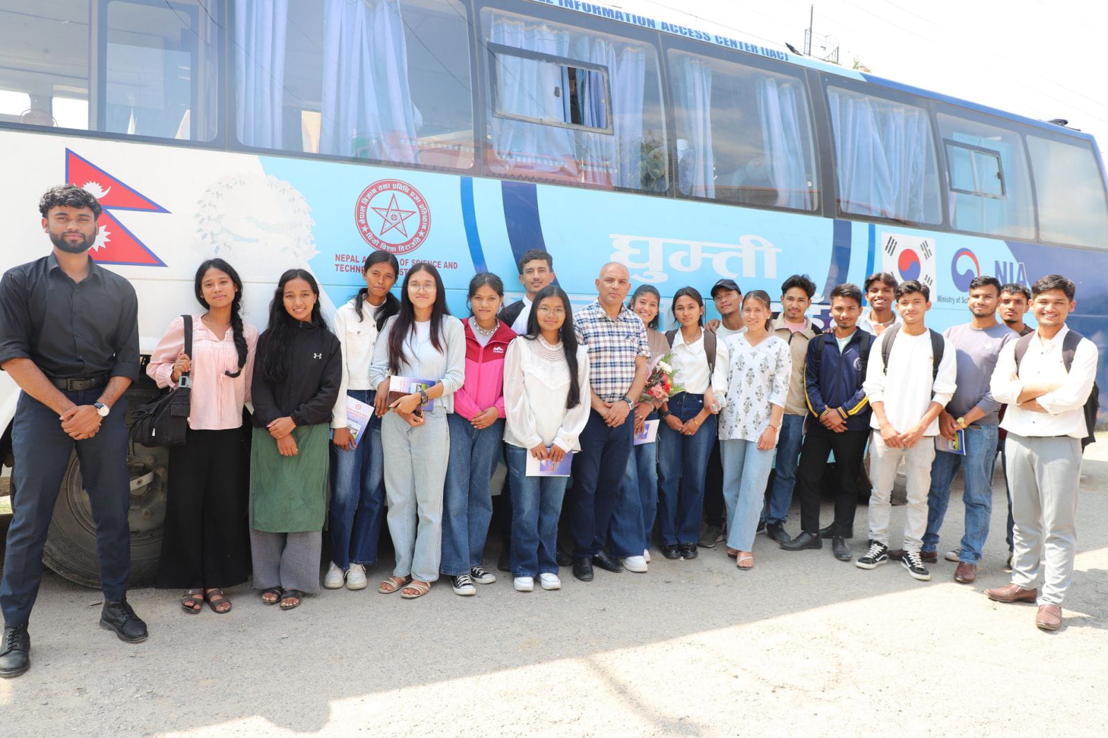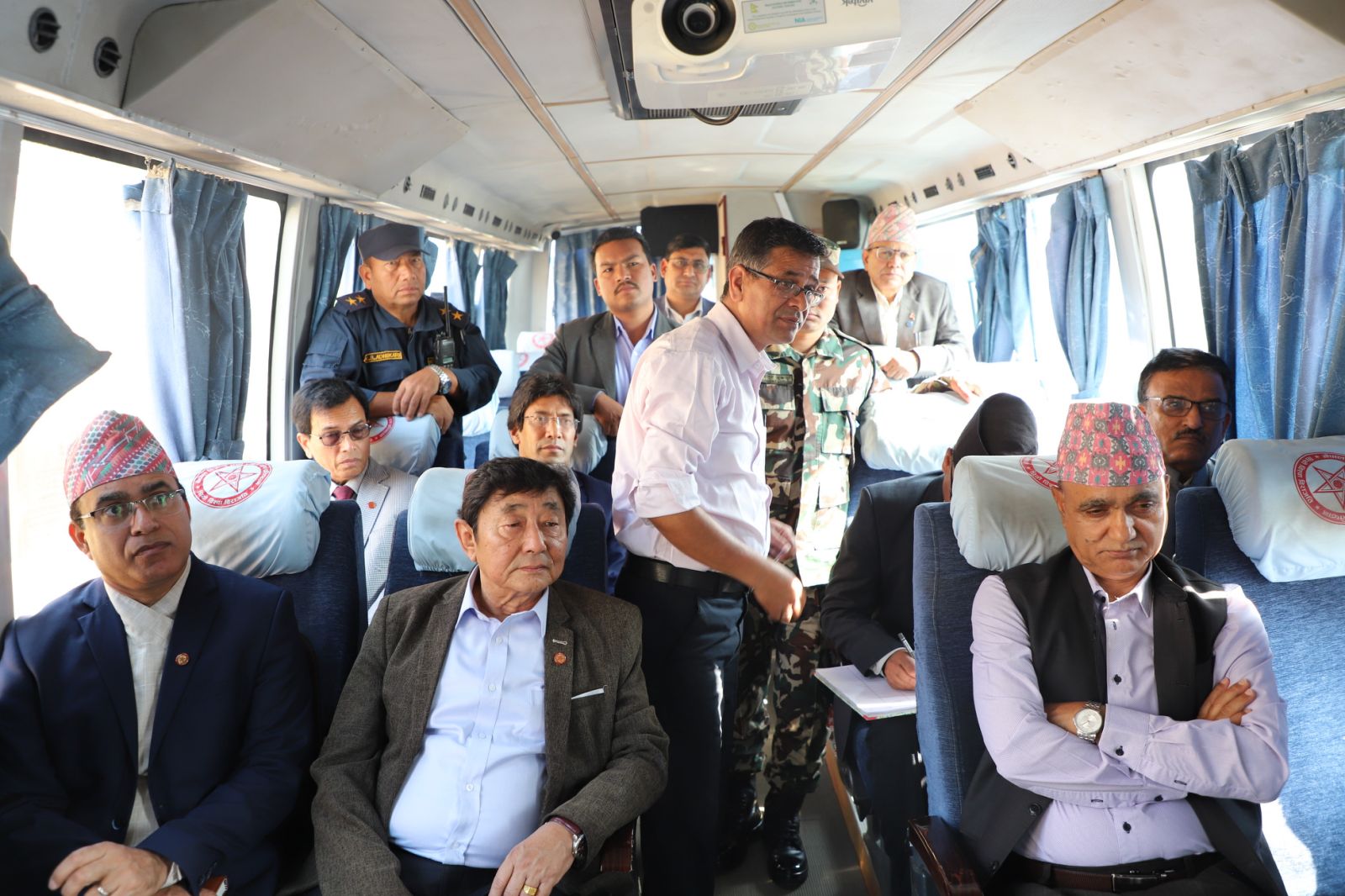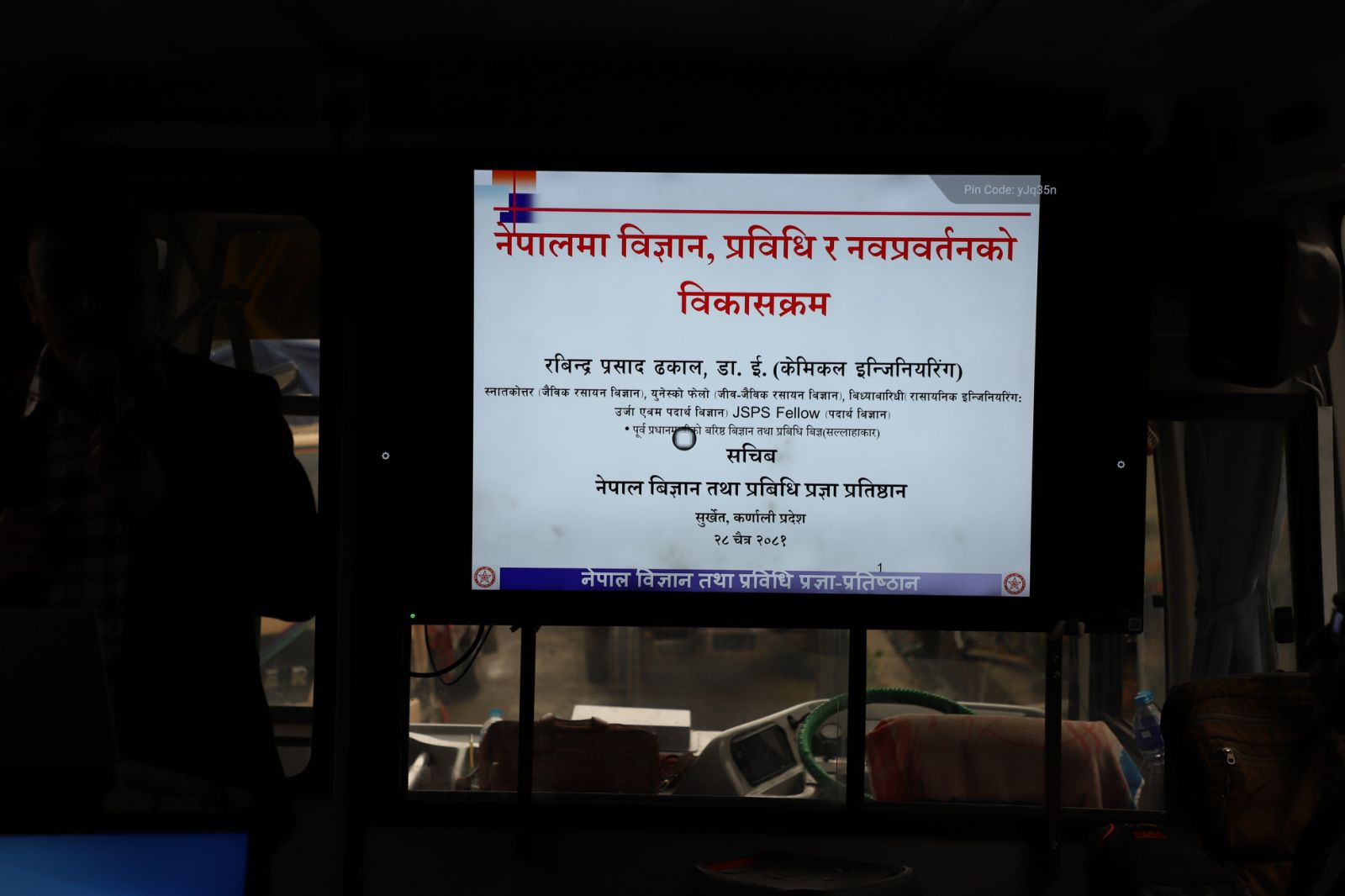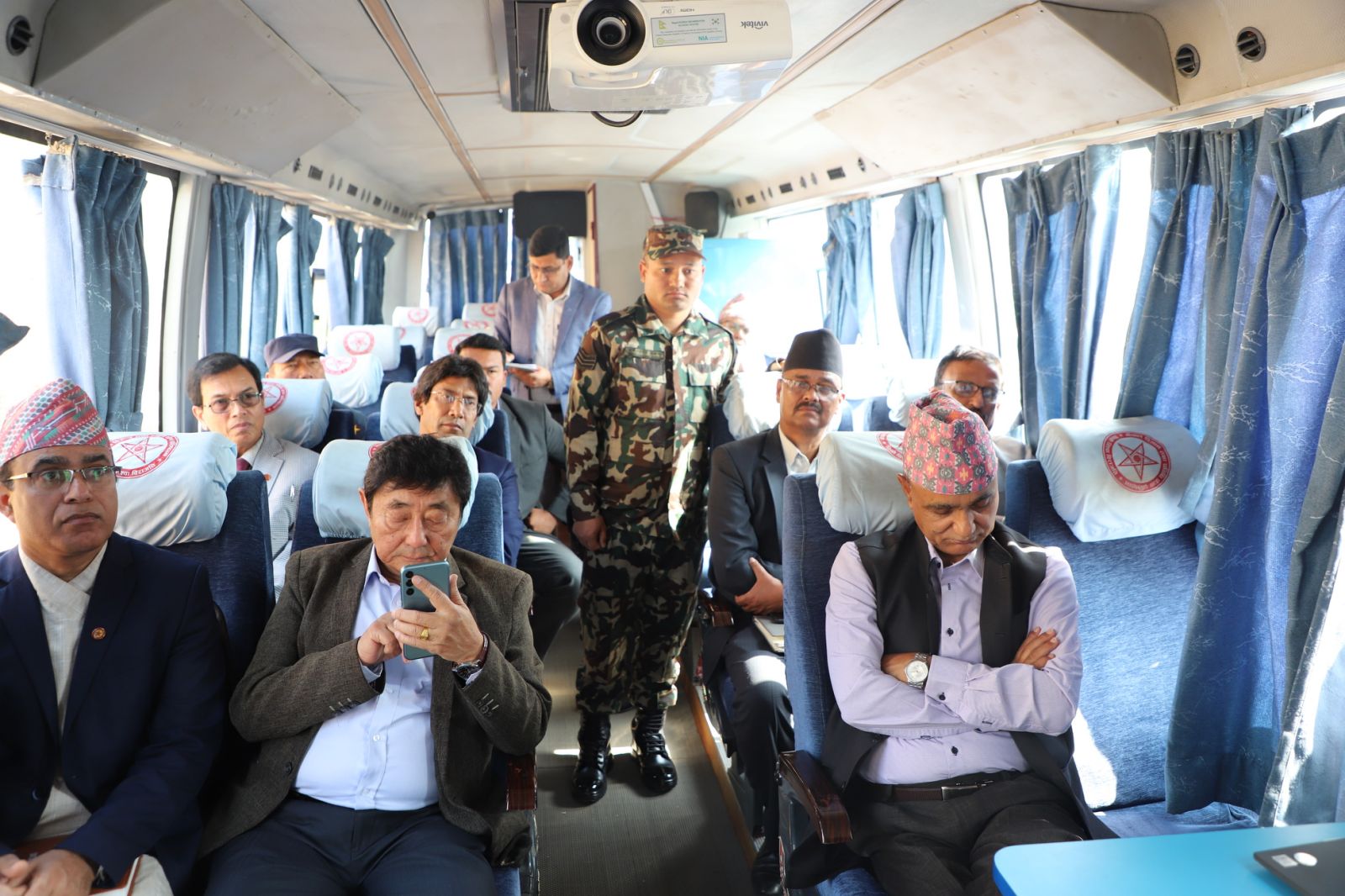 नास्ट को मोबाइल IAC बस अवलोकन गर्नुहुदै मन्त्रि कंडेल, संगै नास्टका श्रीमान् उपकुलपति र सचिब ज्यू